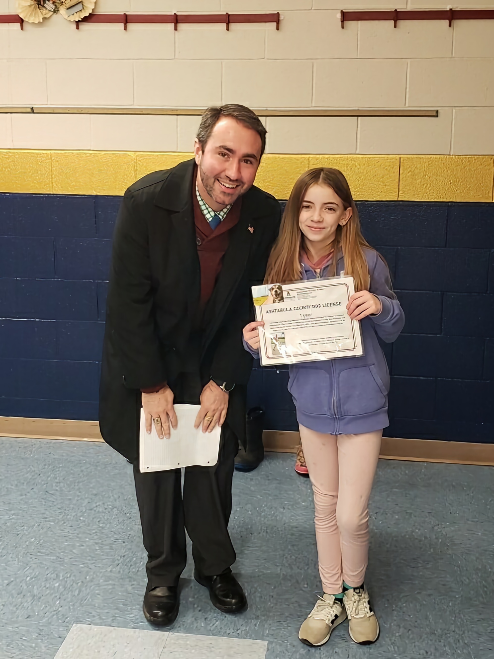 Thomas thanked the students for helping to promote dog licenses and information for the program. All dogs three-months-old or older must register or renew their license each year between December 1 and January 31. Licenses alert the Dog Warden of official ownership and the owner’s contact information if a dog becomes lost or a concern arises. These fees help with shelter costs and Dog Warden funds.
