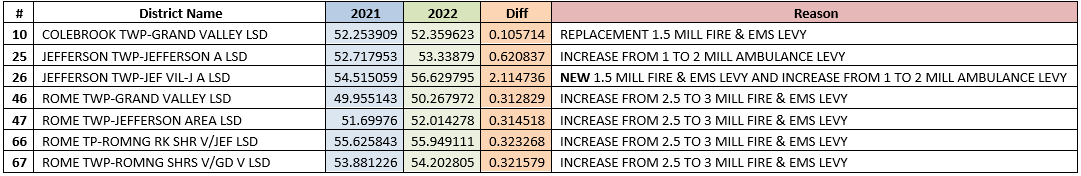Voters however did pass several tax increases resulting in effective tax rates rising. Jefferson Village passed a new 1.5 Mill fire levy, Jefferson Emergency Rescue District increased their Ambulance Levy from 1 to 2 Mills, Colebrook Township replaced their 1.5 Mill Fire and EMS Levy, and Rome Township increase their Fire and EMS Levy from 2.5 Mills to 3 Mills.