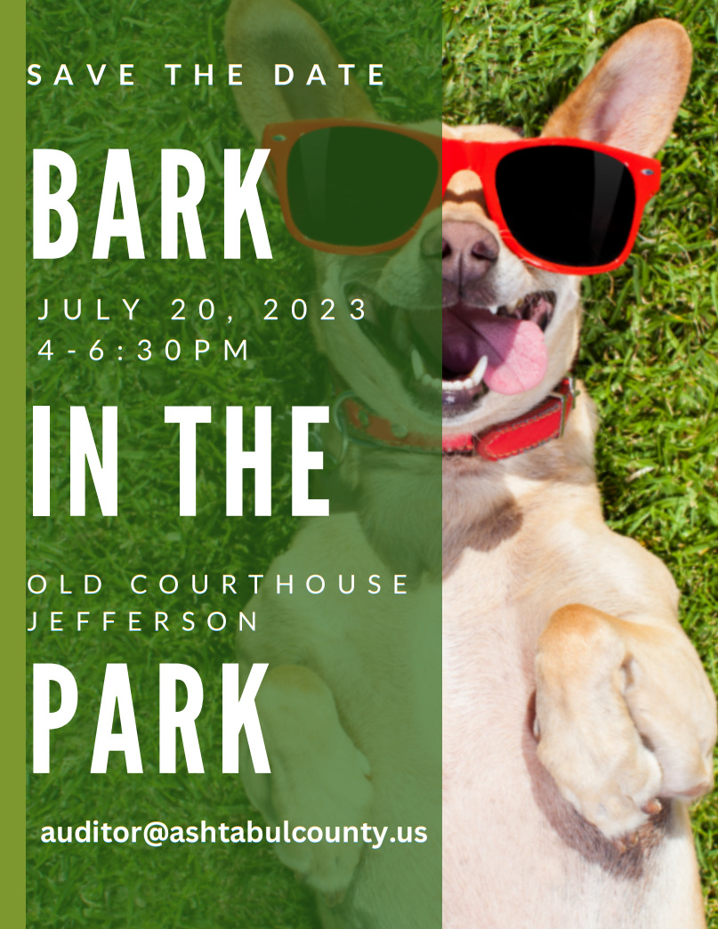 Save the Date- July 20th from 4-6:30pm at the County Courthouse! Our Bark in the Park is returning this year to help celebrate our furry friends and the need to have our County's Pup's licensed. Interested in having a booth or spot at our festival? Email auditor@ashtabulacounty.us