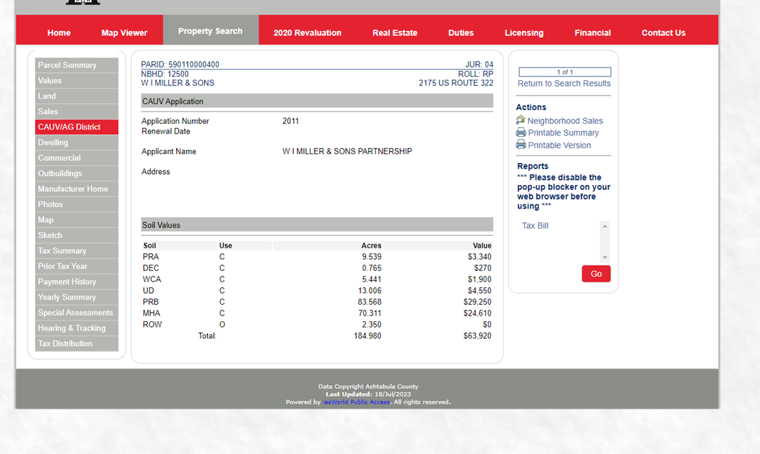 Taxpayers can review their current CAUV soil values on the Auditor’s website in GIS or the property page for a parcel clicking CAUV/Ag District to compare to the New 2023 Soil Values here.