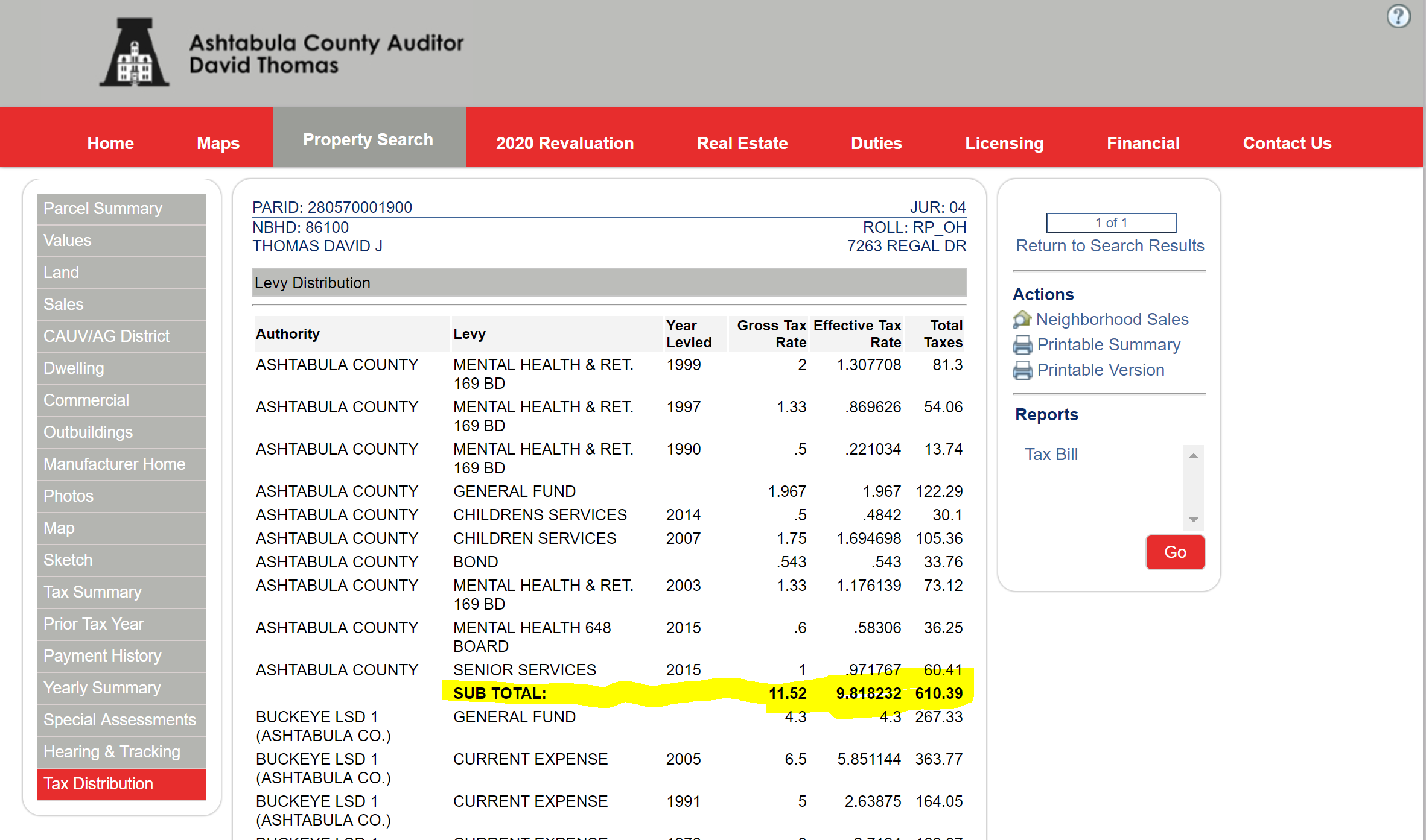 The Tax Distribution tab gives your total tax distribution based on each levy. This screen shows the amount of mills in collection for each levy in your tax district as well as the total distribution per authority for your tax dollars: