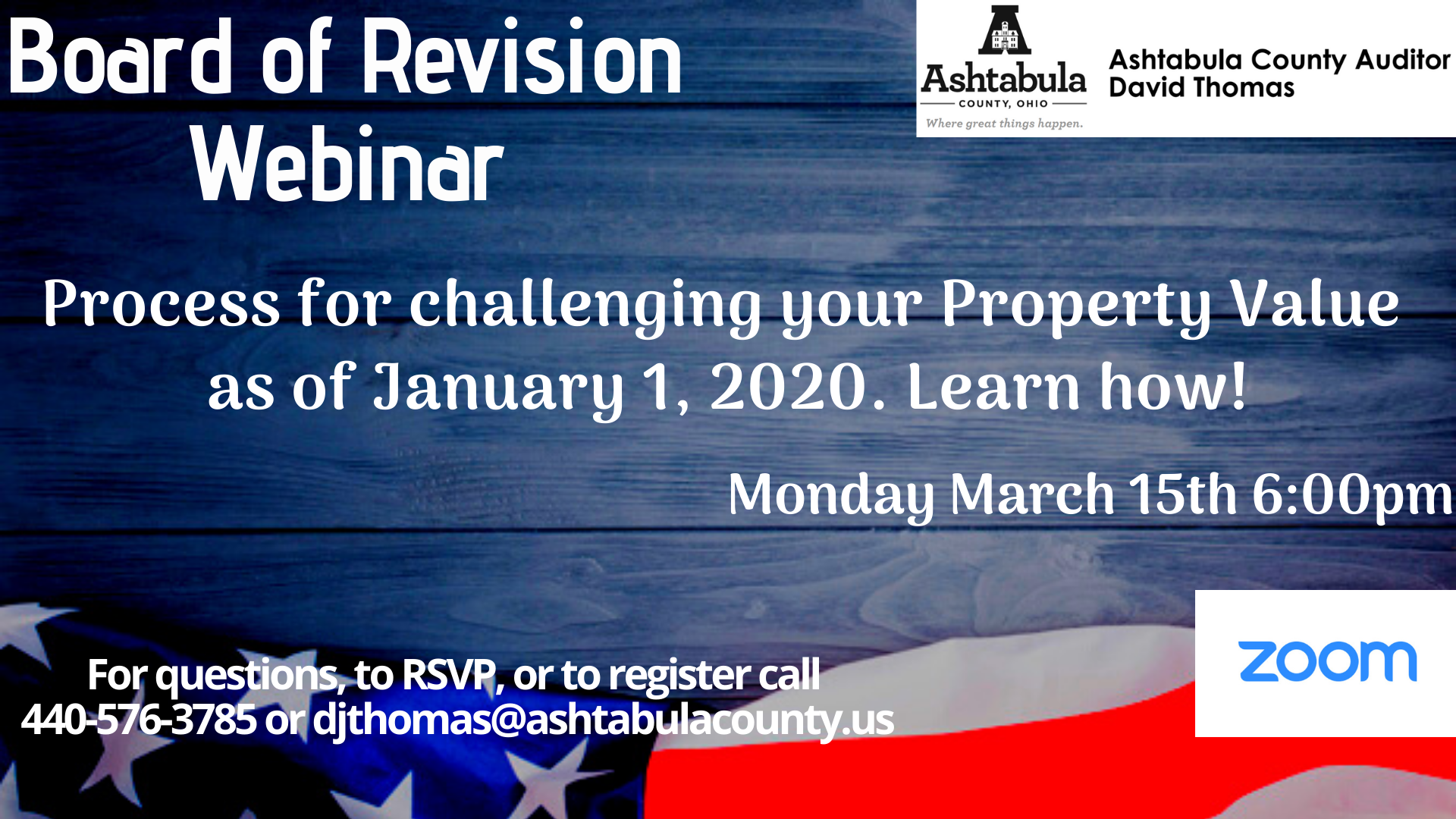 Watch a recorded webinar with the Ashtabula County Auditor's Office to see how to complete your Board of Revision form, what you will need for a successful complaint, and answer frequently asked questions with Tara, the BOR Clerk!