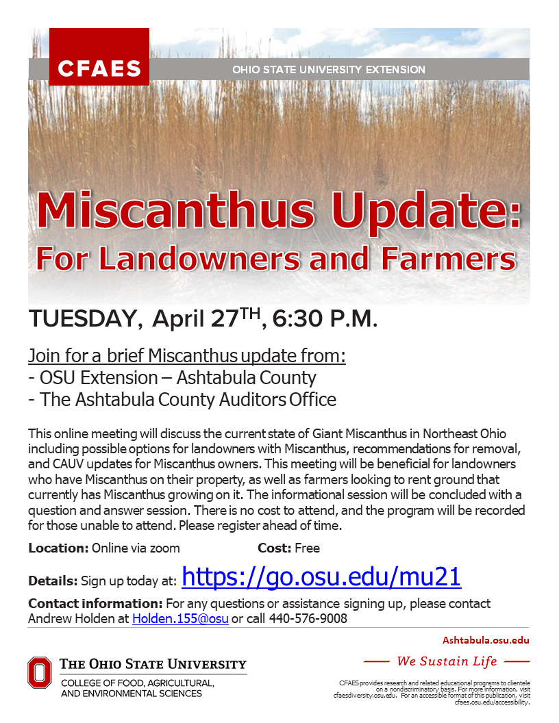 This online meeting will discuss the current state of Giant Miscanthus in Northeast Ohio including possible options for landowners with Miscanthus, recommendations for removal, and CAUV updates for Miscanthus owners. This meeting will be beneficial for landowners who have Miscanthus on their property, as well as farmers looking to rent ground that currently has Miscanthus growing on it.