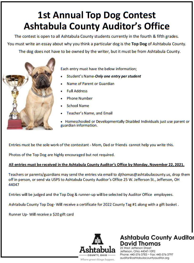 Want to win Dog License #1? Is your dog the Top Dog in Ashtabula County? To share with the whole community how great a lovable companion in your life is, we are holding a contest until November 22, 2021 to see all of the great pups in the county.