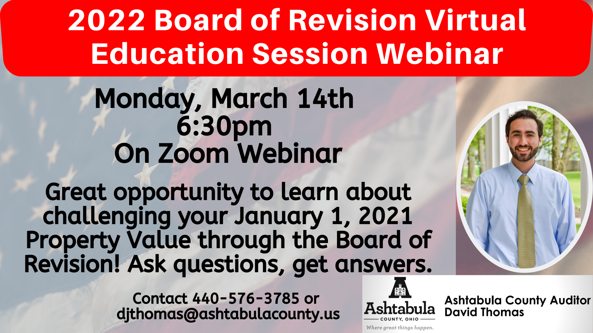 Join Ashtabula County Auditor David Thomas and Assistant Real Estate Manager Tara Frable as they discuss the Board of Revision Process in Ashtabula County for how you can challenge your property value as of January 1, 2021. The BOR is the legal pathway to challenge the Auditor's Market Value for your property. David and Tara will go through the process, what you need to know, and answer any questions!
