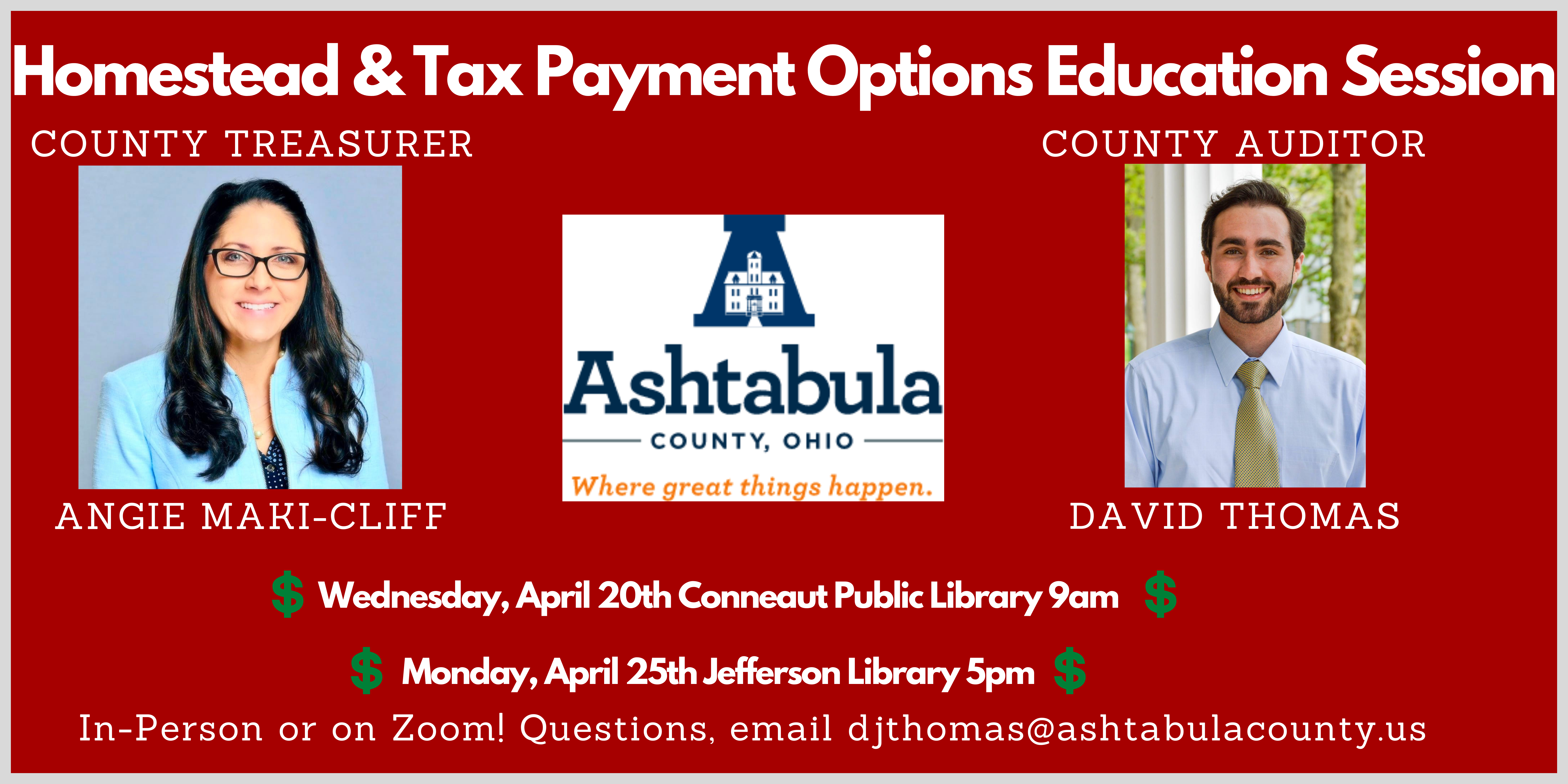 The Auditor’s Office estimates nearly 70 people attended their Homestead sessions prior to Covid and they anticipate similar turnouts this year. Those who are unable to attend can watch online by Zoom or Facebook live. To register for Zoom, attendees can visit the County Auditor website or contact Auditor Thomas at 440-576-3785 or djthomas@ashtabulacounty.us. No pre-registration for in person attendance is needed.